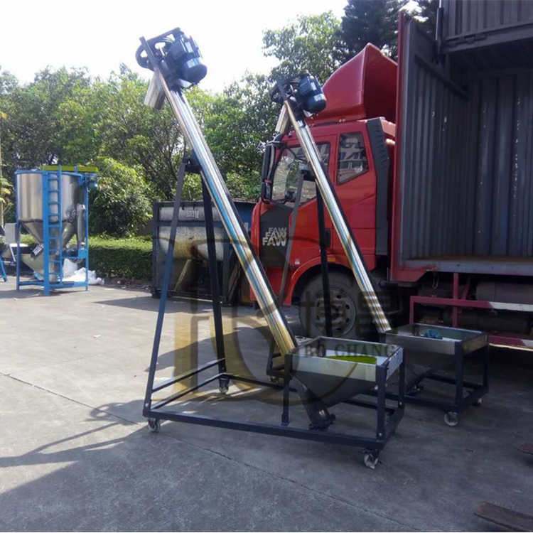 4、物料放入料箱便能在上料電機的動力下,通過螺旋提升物料,物料從出料口排出進入攪拌機或儲料倉。